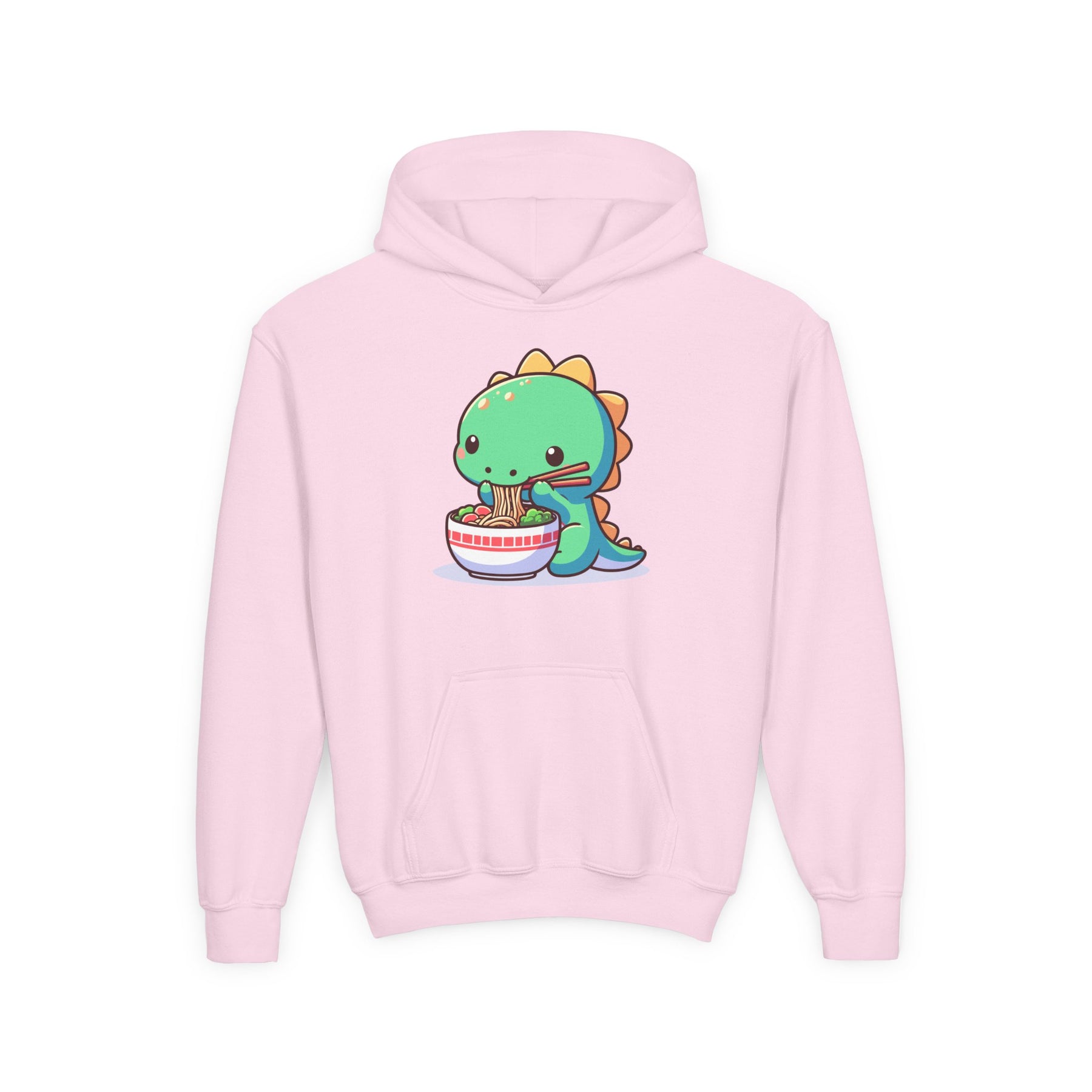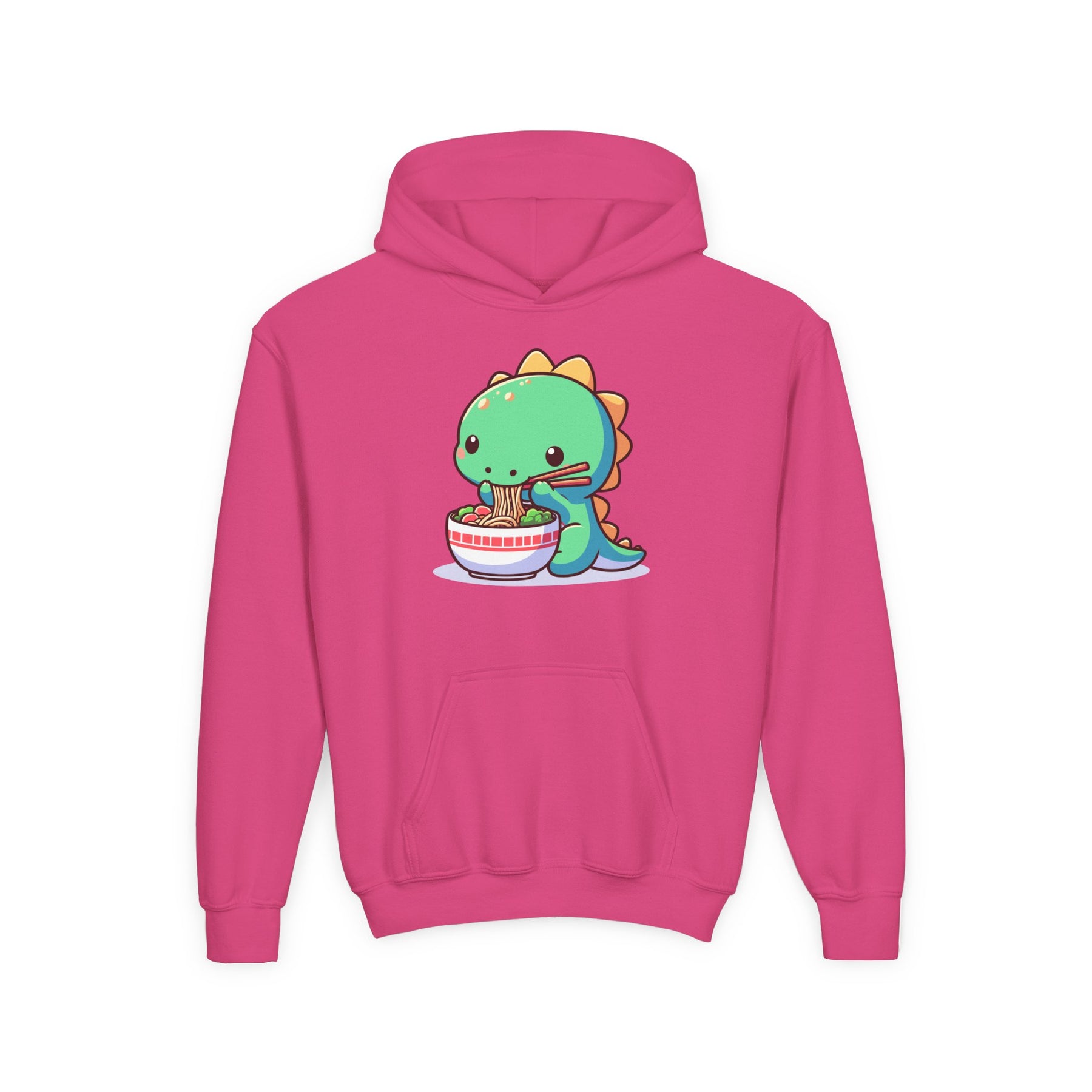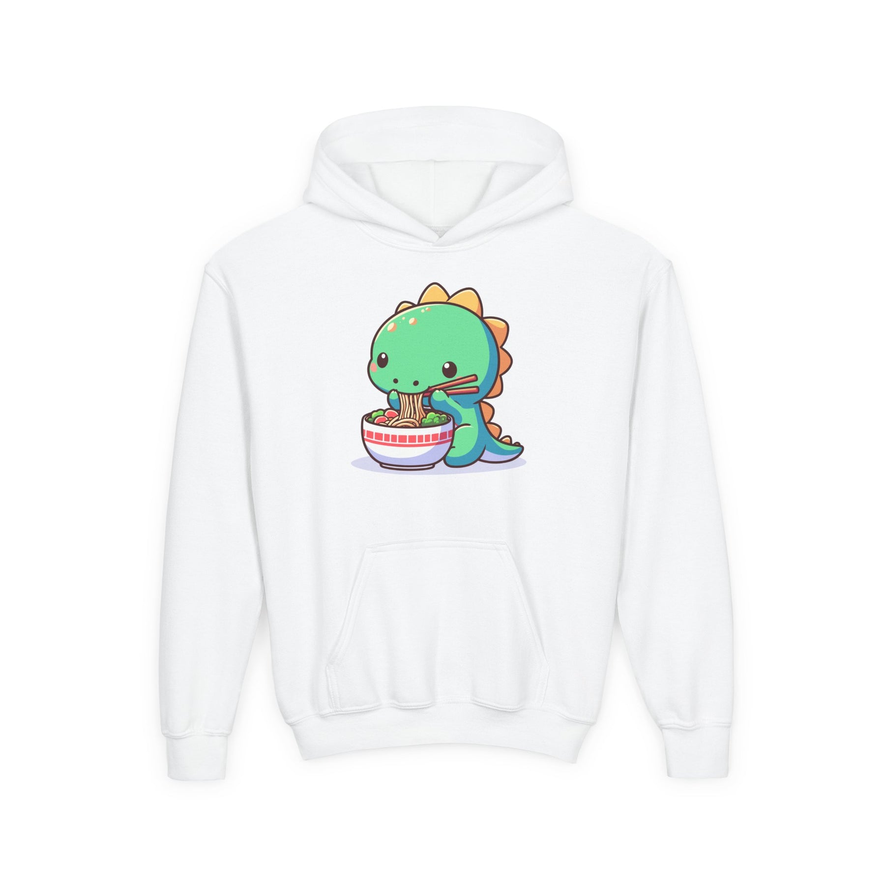 Meet Ramen Rex – the cozy king of comfort food and cuddle vibes! This ultra-soft youth sweatshirt features a friendly dinosaur enjoying a giant bowl of ramen, blending prehistoric fun with foodie flair.